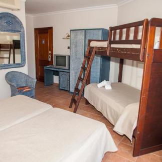 La Habitación Cuádruple está diseñada para acomodar a toda la familia o a grupos de amigos con total comodidad. Equipada con dos camas individuales de 90 cm unidas y una litera, ofrece un espacio funcional y acogedor con muebles rústicos en maderas nobles o mimbre.
